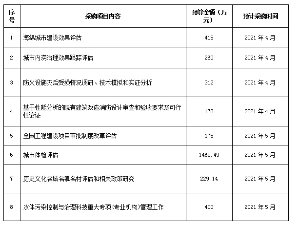为便于供应商及时了解政府采购信息,根据《财政部关于开展政府采购意向公开工作的通知》(财库〔2020〕10号)等有关规定,现将住房和城乡建设部2021年4-5月政府采购意向公开如下: